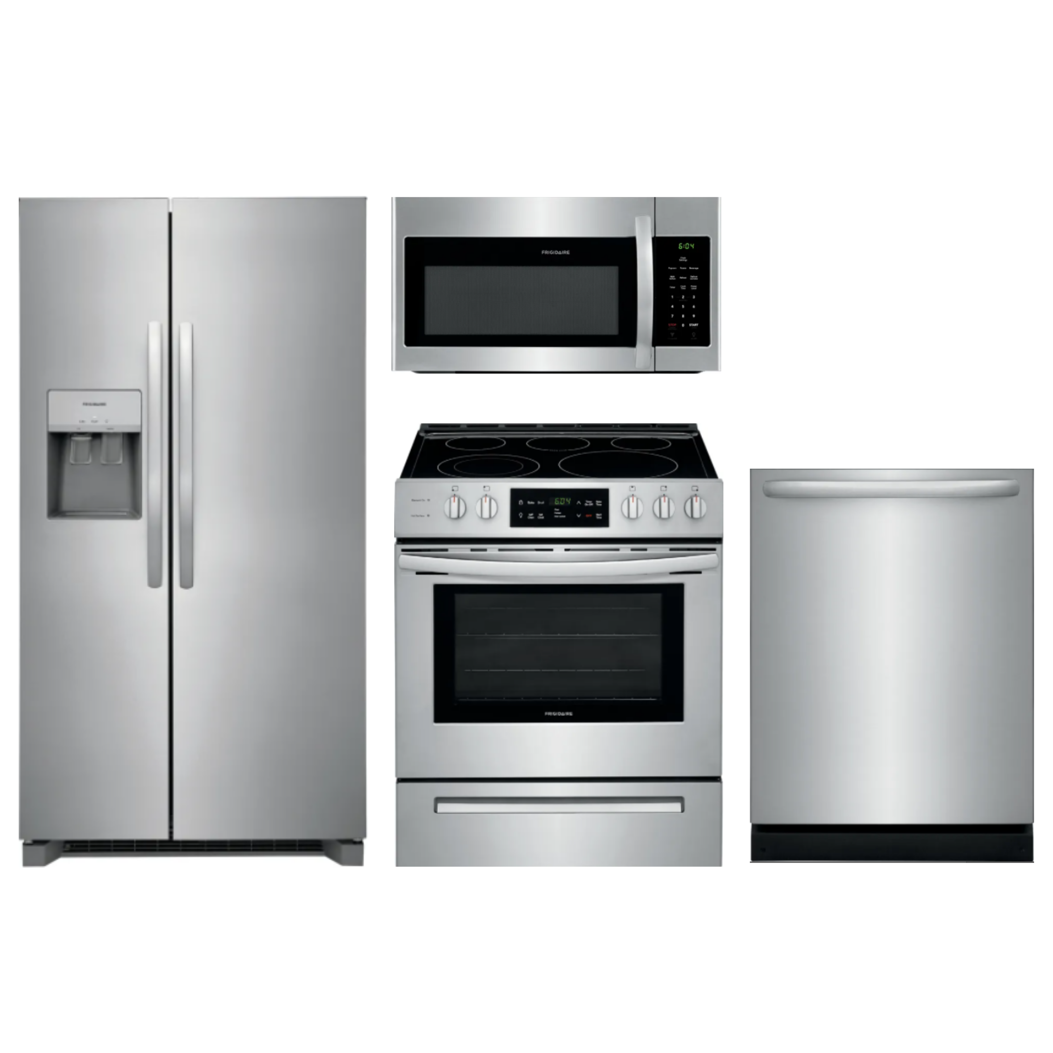 Frigidaire® 4 Piece Premium Kitchen Package-Stainless Steel with Side-by-Side Refrigerator, Slide-In Electric Range, Built-In Dishwasher, and Over The Range Microwave.Read More