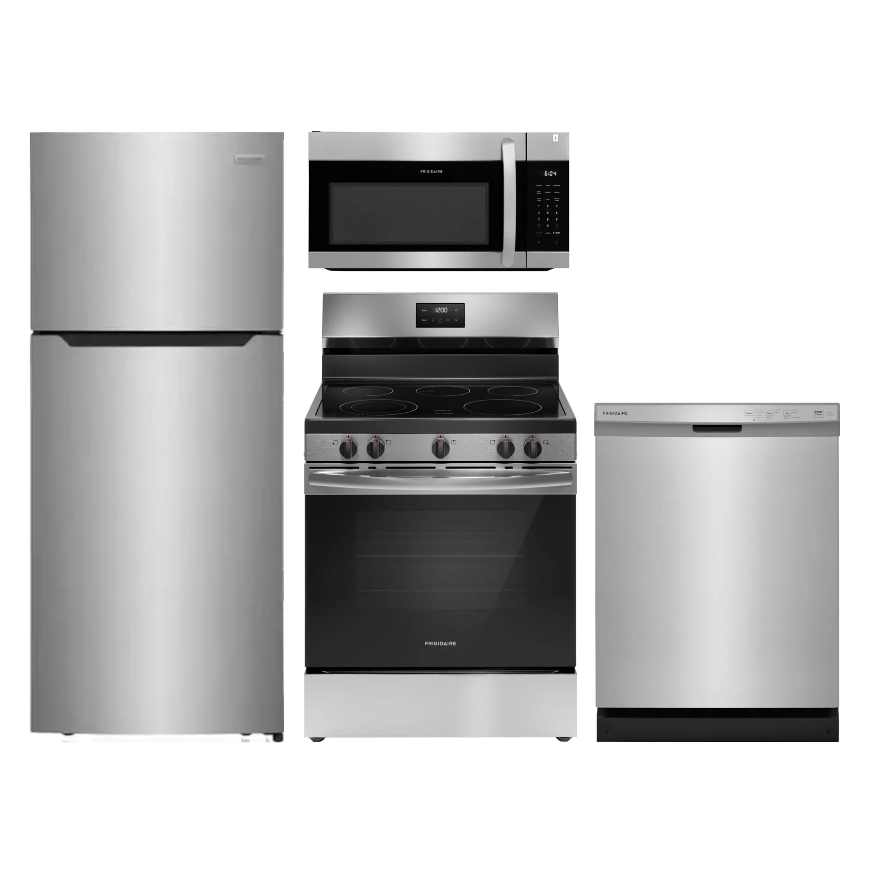 Frigidaire® 4 Piece Stainless Steel Kitchen Package with top freezer refrigerator, freestanding electric range, built in dishwasher and over the range microwave.Read More