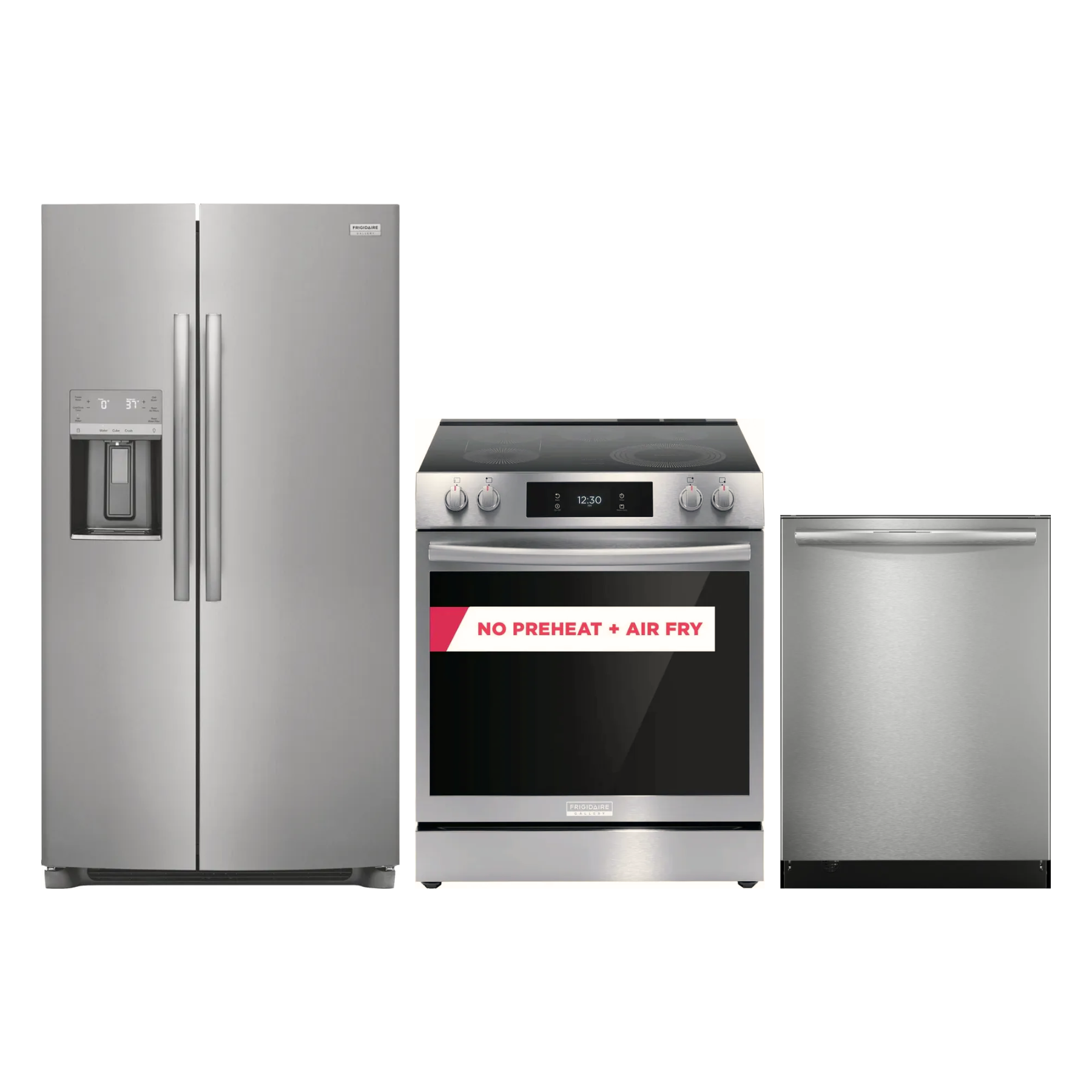 Frigidaire Gallery® 4 Piece Stainless Steel Kitchen Package with side by side refrigerator, free standing electric range, and built in dishwasher.Read More