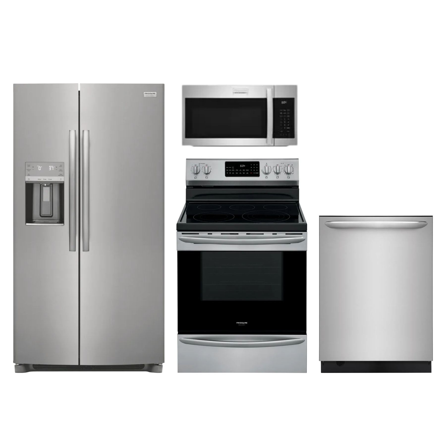 Frigidaire Gallery® 4 Piece Stainless Steel Kitchen Package with side by side refrigerator, free standing electric range, built in dishwasher and over the range microwaveRead More