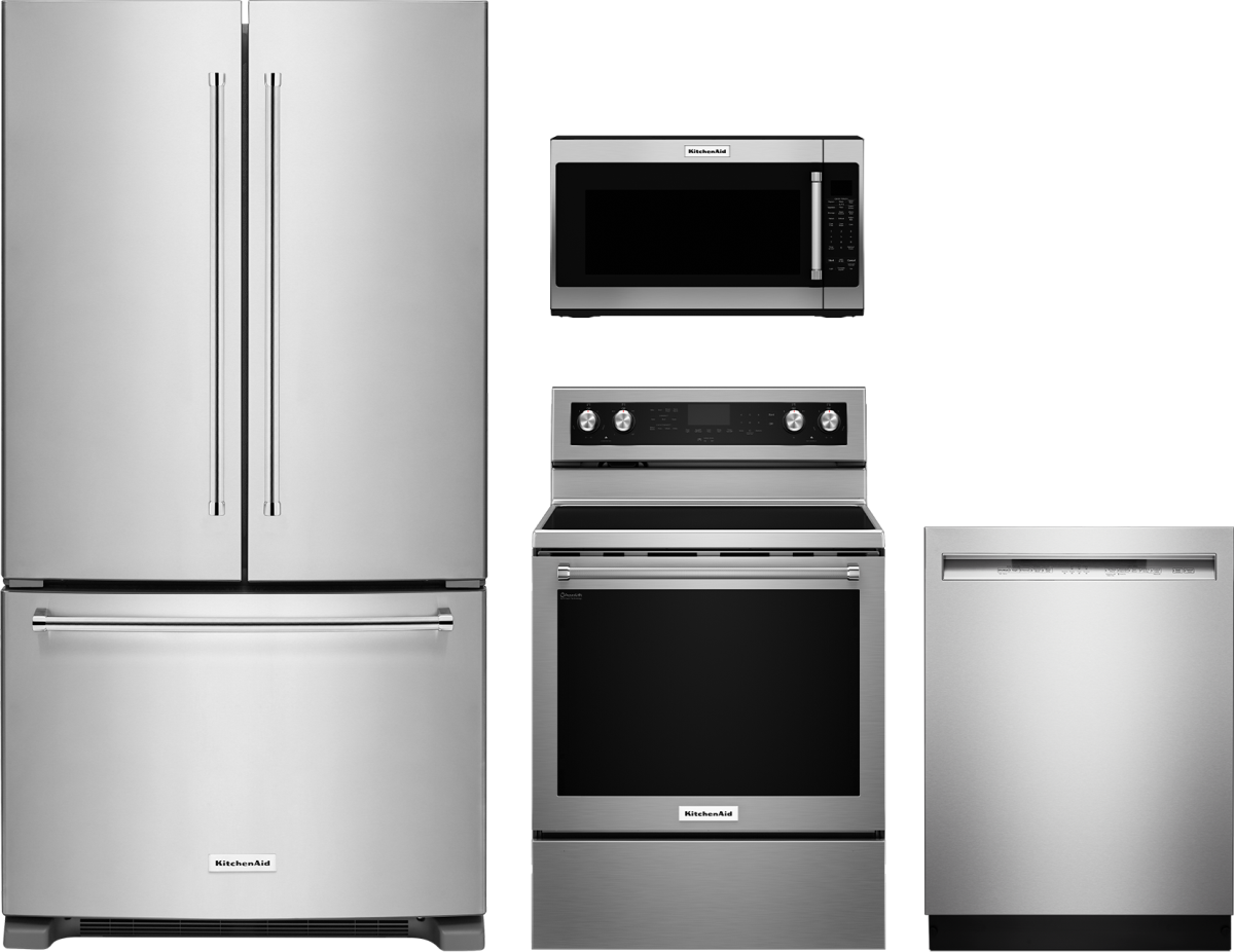KitchenAid® 4 Piece Stainless Steel Kitchen Package with a counter depth french door refrigerator, free standing electric range, built-in dishwasher and over the range microwaveRead More