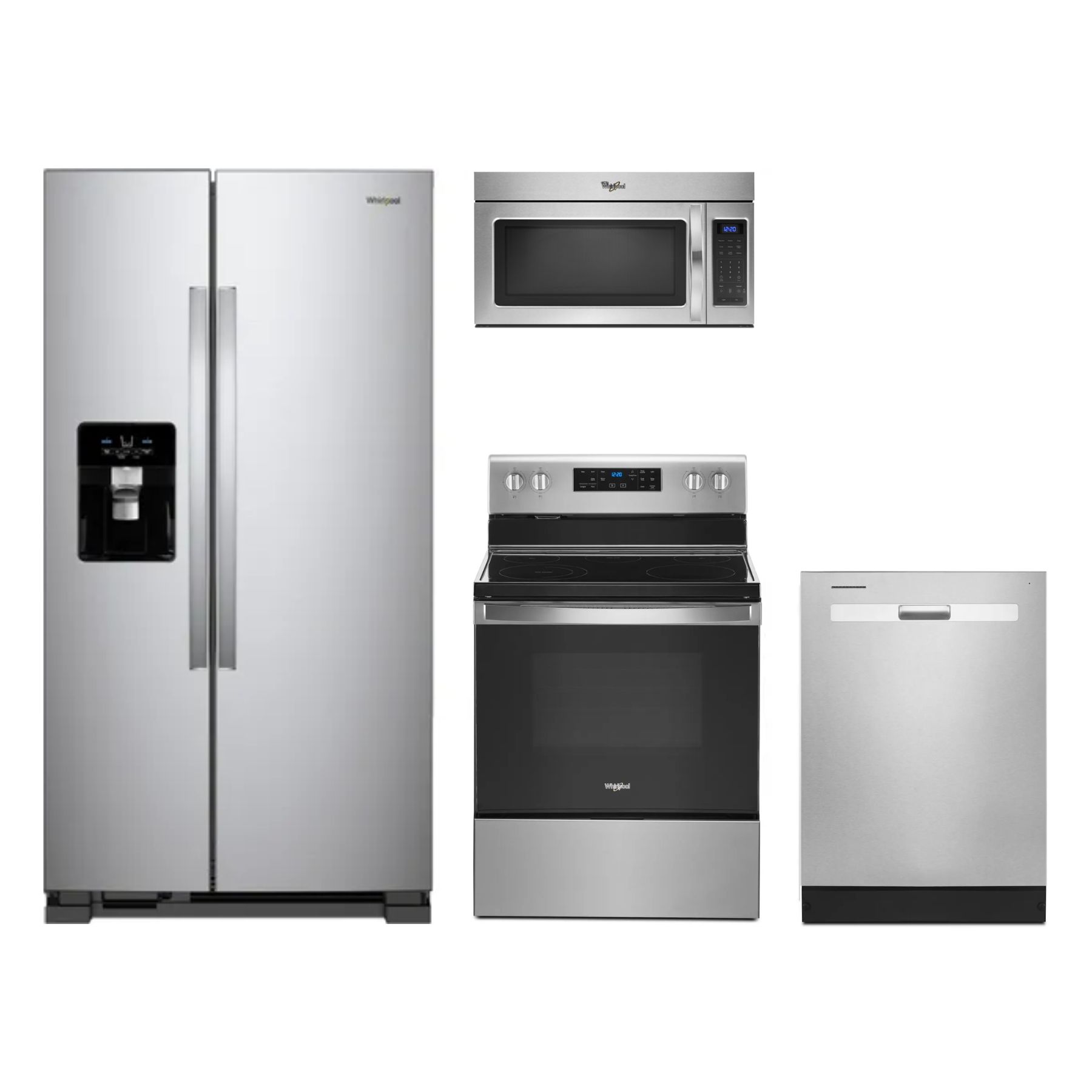 Whirlpool® 4 Piece Kitchen Package-Stainless Steel with a side-by-side refrigerator, free standing electric range, built in dishwasher and over the range microwaveRead More
